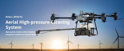To address the challenges in PV cleaning, Wisson Robotics introduces a comprehensive solution centered around the Orion AP30-P2 Pliabot® Aerial High-pressure Cleaning System. Based on Pliabot® Technology, the AP30-P2 features an aerial multi-angle high-pressure cleaning mechanism, designed to tackle high-altitude cleaning and spraying tasks. The system can hover in the air and perform precise, multi-angle cleaning while enabling rapid transfers between different cleaning zones, significantly enhancing operational efficiency.