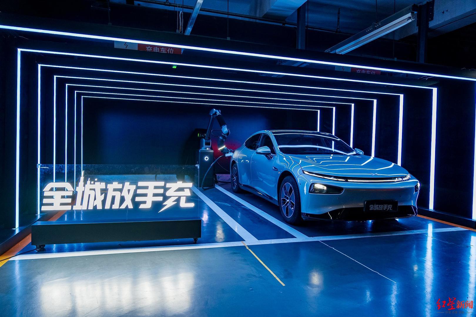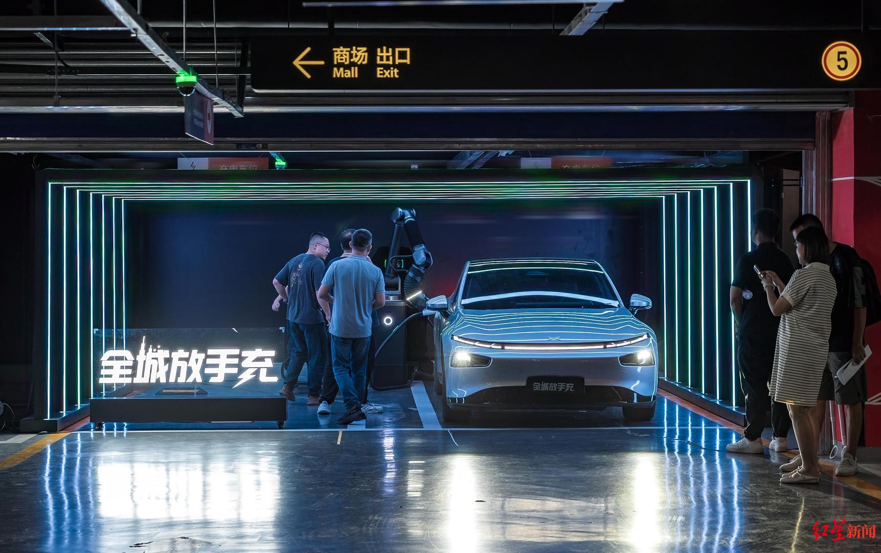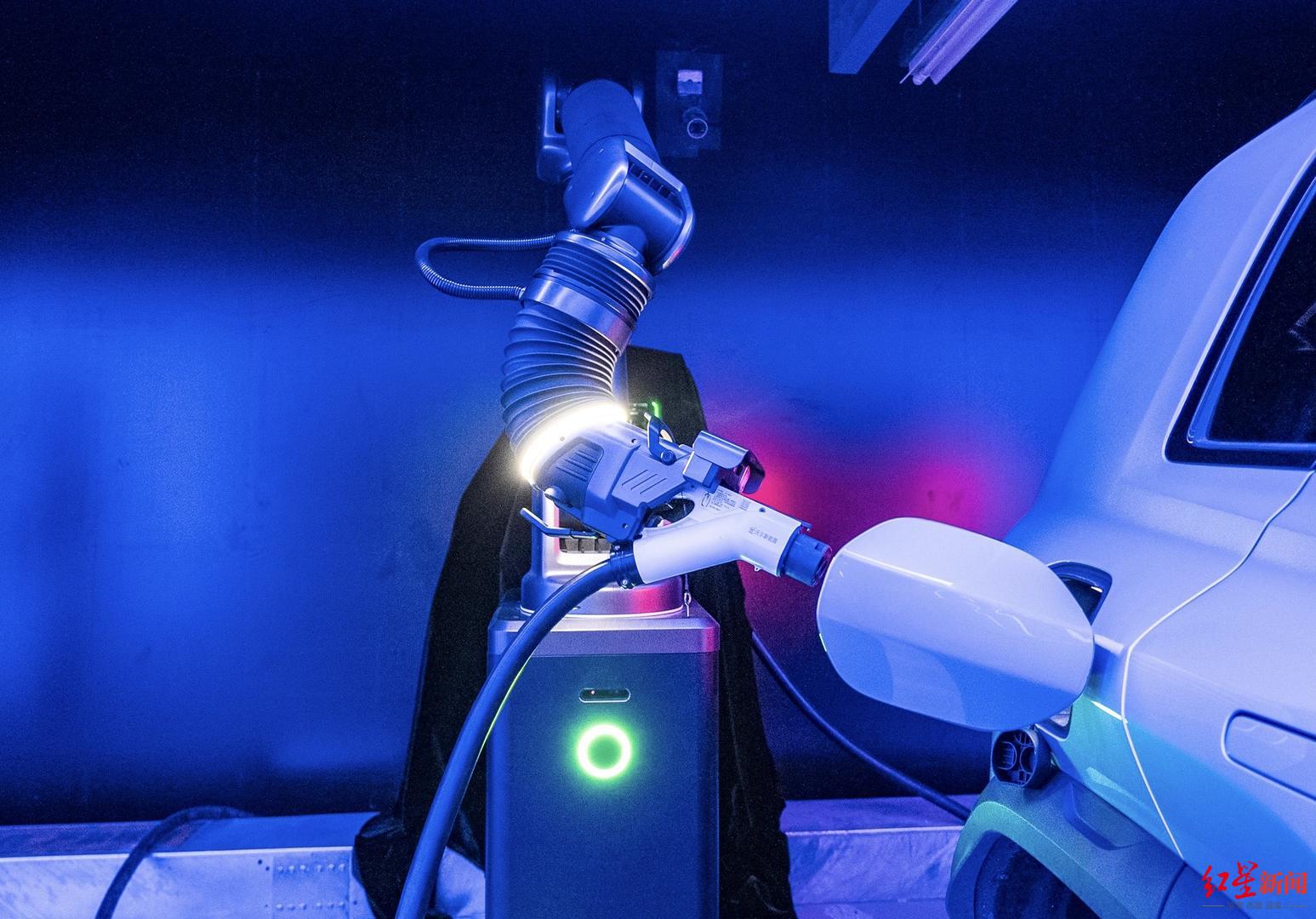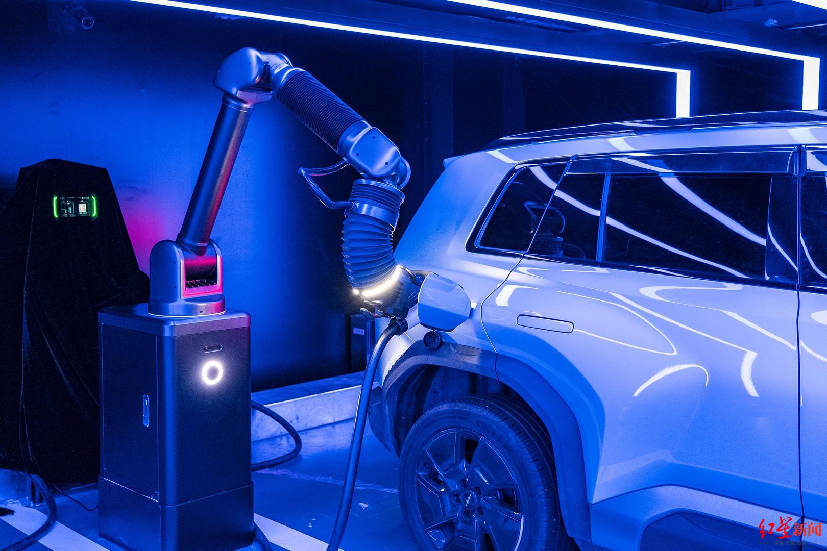 车主体验: “停车、充电完全解放双手” 走进场站,装饰极具未来科技感的区域内,一台黑色涂装的自动充电机器人若隐若现、近乎“隐身”。旁边一台电动车车主正举着手机,等待车辆自动泊车入位后,记录自动充电机器人完成充电的一刻。 “我家住在附近,今天刚好将车开过来充电、买东西,看到了‘全城放手充’几个字,就把车挪过来试试。”吴先生告诉红星新闻记者,这是他第一次见到这样的场景,感觉很新鲜。