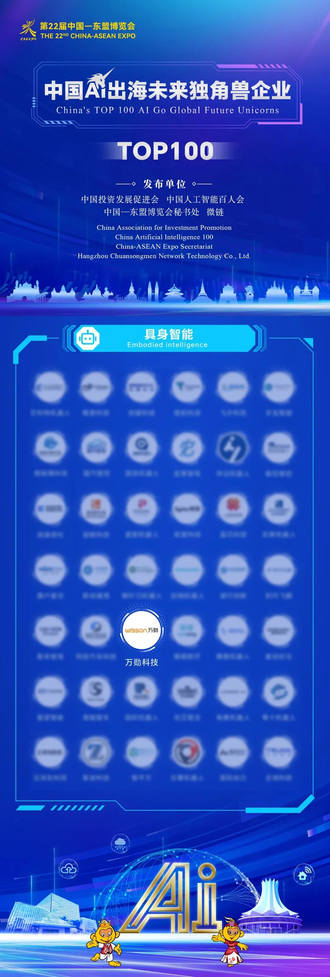 AI出海未来独角兽!万勋科技东盟博览会斩获殊荣9月17日-21日,由中国商务部和东盟国家政府经贸主管部门及东盟秘书处共同主办的第22届“中国一东盟博览会”(以下简称东博会)在广西南宁隆重举行。本届东博会首设人工智能专馆,重点展示了中国与东盟国家 AI前沿技术与核心产品,以及AI赋能应急救援、医疗、制造、交通、农业等领域的场景应用。作为通用软体机器人全球领航者,万勋科技受邀出席大会专题活动,并荣获“中国AI出海未来独角兽企业TOP100”殊荣。