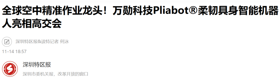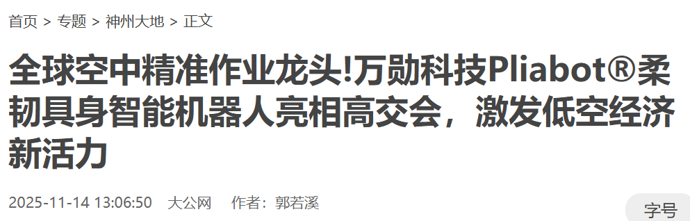 中央广播电视总台专题报道“点赞”,万勋Pliabot®柔韧具身智能机器人实力“出圈”在第二十七届中国国际高交会上,万勋科技向全球展示了基于Pliabot®技术的一系列柔韧具身智能空中精准作业机器人、柔韧全自动充电机器人及丰富的行业解决方案与应用案例,凭借“硬核科技”与“产业应用”的深度融合成为全场焦点,并受到中央广播电视总台专题报道。 总台作为中国最具权威性、覆盖面和影响力的国家级媒体集团,其报道通过下属央视、央广、中国国际电视台与国际广播电台等的数十个海内外终端广泛传播,专题报道不仅体现了对科技创新成果的高度认可,更极大提升了柔韧具身智能机器人的社会认知与影响力。除总台外,近期深圳卫视、南方都市报、大公报、亿欧网、深圳特区报、深圳商报、晶报等多家主流及专业媒体也已纷纷对万勋科技的最新进展予以重点关注和积极评价。