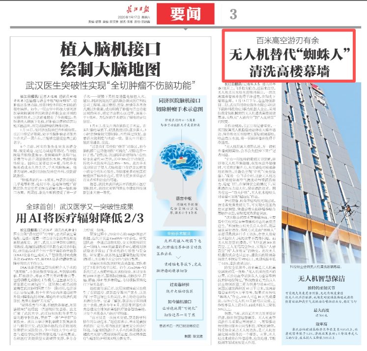 《长江日报》关注 | 万勋P3机器人替代“蜘蛛人”清洗高楼幕墙日前,武汉科投物业服务有限公司联合万勋科技,利用万勋AP3-P3空中清洗机器人,在武汉生物创新园二期完成了高楼玻璃幕墙清洗作业,受到《长江日报》重点关注报道。报道指出,无人机高空清洗作为重要低空经济场景之一,有望推动传统物业服务业向高科技、智能化转型,此次武汉科投物业联合万勋科技试点无人机清洗,是智慧化城市服务的一个缩影。以下为报道全文: ![]() 地面上,飞手指尖轻点,近百米高空,无人机高压水枪水流喷涌而出,一块块玻璃幕墙被冲洗得干净透亮,在阳光下熠熠生辉。近日,在生物创新园二期,武汉科投物业服务有限公司(以下简称科投物业)联合机器人企业,采用挂载柔韧机械臂的无人机清洗高楼玻璃幕墙,实现从“人悬高空”到“人在地面”的转变。 在作业现场,长江日报记者看到,一架四旋翼无人机稳稳地悬停在大楼外墙边,携带的高压水枪喷头紧贴玻璃幕墙,喷出高压水流,将一面面幕墙冲洗得干净透亮。 “无人机距离大楼那么近,万一碰到外墙或附属物,会不会失控掉下来?”记者问道。 “它有一项独特的柔韧关节装置,能够使无人机不惧碰撞,在发生意外碰撞时,可柔性消解外力,从而避免对玻璃幕墙的损伤,并避免出现‘炸机’(失控坠落)。”现场一位飞手介绍,这款无人机还能有效抵御高空气流扰动与喷洒后座力,稳定飞行,在保障安全的情况下,实现清洗压力最大化,保证清洗效果。因为有这一“功夫护体”,无人机水枪喷头对幕墙可实现“超近距”作业。 针对屋檐、转角等结构性死角区域,该设备凭借柔韧关节,可实现大范围角度灵活调整,使清洁喷头能够精准贴合幕墙作业面,实现无死角深度清洁。 ![]() “这次联合的技术方案解决商,主要看中其应对复杂异型建筑形态的高度适应性。”科投物业相关负责人介绍,高层建筑幕墙清洗,传统方式是由“蜘蛛人”从楼顶悬绳进行手工清洗,存在人员安全风险较大、清洗效率不高等问题。而无人机智慧化清洗,可飞行至近300米高空,工人无需高空作业,实现从“人悬高空”到“人在地面”的转变。 此次无人机清洗试点结果显示,清洗后的玻璃幕墙透光率恢复至95%以上,水渍残留率低于0.1%,清洗效果良好。 除安全优势外,效率高是无人机高空清洗的又一优势。“无人机清洗技术的应用,正推动高空清洗从人力密集型向技术驱动型转变。”科投物业有关负责人以生物创新园二期为例进行效率对比,该园区建筑面积近40万平方米,玻璃幕墙总面积约9万平方米,如果采用传统“蜘蛛人”作业,100人可在10天完成清洗,而20台无人机10天就可以完成,工作效率是人工的5倍,而成本较人工降低30%以上。 据悉,当前,武汉正在大力发展低空经济,推进智慧城市建设。无人机高空清洗作为重要应用场景之一,有望推动传统物业服务业向高科技、智能化转型,科投物业试点无人机清洗,是无人机智慧化城市服务的一个缩影。未来,无人机技术或将在外墙巡检、应急处理、节能检测等领域发挥更大作用。