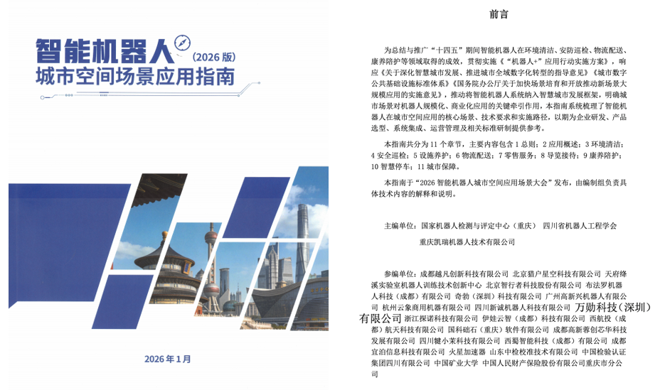 以柔韧具身智能建设智慧城市,万勋科技参编《智能机器人城市空间场景应用指南》日前,由成都市经信局、发改委、住建局等单位指导举办的2026智能机器人城市空间应用场景大会在成都举行。会上,《智能机器人城市空间场景应用指南》(以下简称“指南”)正式发布。作为通用软体机器人全球领航者,万勋科技深度参与了指南编制工作。 ![]() 指南明确了城市场景对机器人规模化、商业化应用的关键牵引作用,系统梳理了智能机器人在城市空间应用的核心场景、技术要求和实施路径,被视为首本全景式落地“说明书”,旨在降低试错成本,推动行业从“示范秀”走向“规模用”。 基于全球独创的Pliabot®柔韧技术,万勋科技彻底突破了机器人大规模普及应用所面对的适应性和成本两大瓶颈,以柔韧具身智能架构为各行各业打造低成本、高适用性的智能机器人,广泛应用于高空清洁、自动充电、能源运维等领域,加速机器人时代的到来。 在高空清洁领域,万勋AP3-P3空中清洗机器人依托Pliabot®柔韧关节,可实现自适应平衡、高度碰撞安全保障、超近距作业、宽幅扇面高效喷射等独特性能,为行业提供了真正具备盈利能力的创新无人机空中清洗方案;新能源智驾领域,万勋"柔韧自动充"解决方案在成都完成了业内首次跨品牌、跨车型、普及式公开商用运营,一举打造业内首个高用量自动充电机器人案例,已为多类型客户在成都、北京、深圳等多地部署测试与运营站点,场站规模与机器人数量持续增加。 ![]() 会上,万勋科技还携手产业链上下游企业成立了“智能机器人场景应用生态联盟”,与中建西南院科技公司等场景方签署了战略合作项目,通过推动场景对接与联合推广破解机器人规模化落地难题,共同助推机器人产业高质量发展与智慧城市建设。